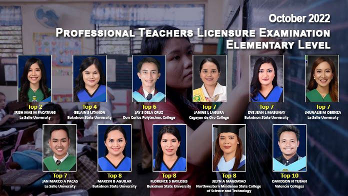 ELEVEN (11) graduates from schools in Northern Mindanao landed in the Top 10 of the October 2022 Licensure Examination for Professional Teachers Elementary Level. They are TOP 2 – Irish Mae M Pacatang (La Salle University), TOP 4 – Gerain Sarimos Litanon (Bukidnon State University), TOP 6 – Jay Singson Dela Cruz (Don Carlos Polytechnic … Continue reading NorMin schools produce 11 Topnotchers in October 2022 Professional Teachers Board Exam Elementary Level