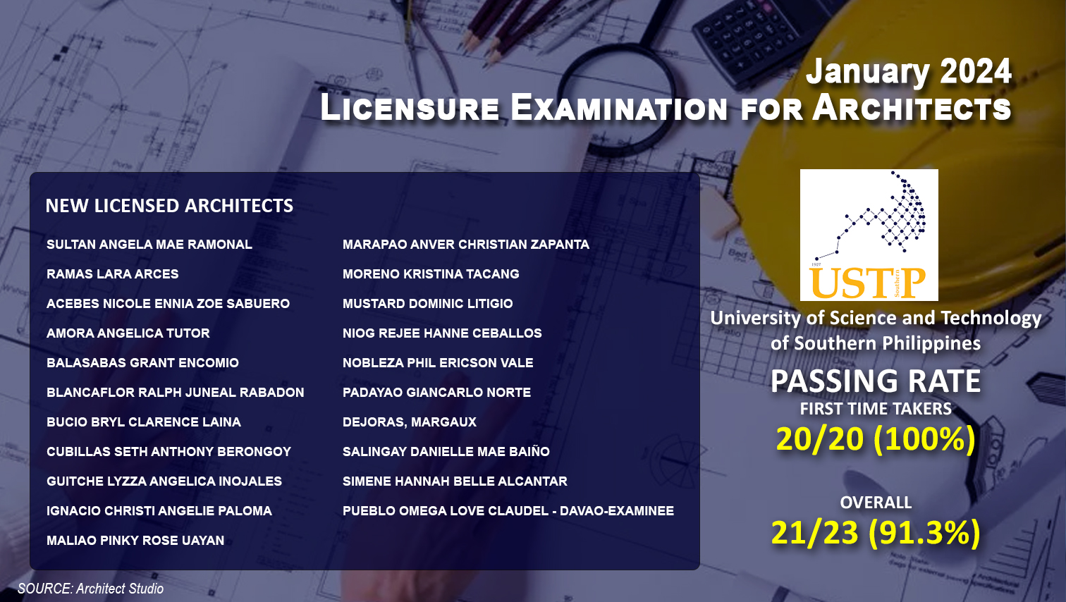 The University of Science and Technology of Southern Philippines (USTP) in Cagayan de Oro has produced twenty-one (21) new architects including a 100 percent passing rate for first timers (20/20) and 91.30% overall (21/23) in the January 2024 Licensure Examination for Architects. Congratulations!
