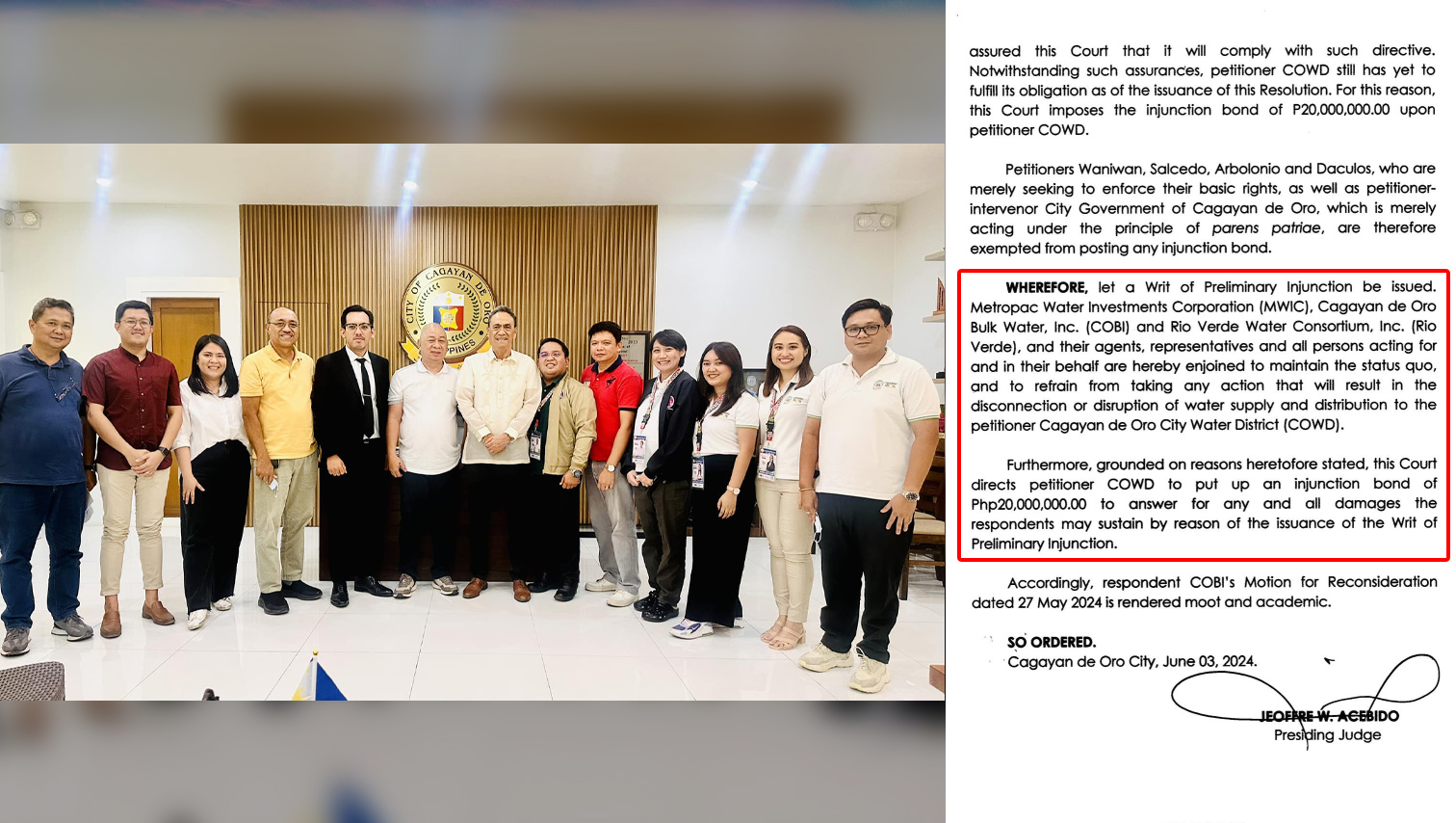 A regional trial court in Misamis Oriental has issued a Writ of Preliminary Injunction against respondents Metropac Water Investments Corporation (MWIC), Cagayan de Oro Bulk Water, Inc. (COBI) and Rio Verde Water Consortium, Inc. (Rio Verde). RTC Branch 41 Presiding Judge Jeoffre W. Acebido issued the Writ of Preliminary Injunction through a resolution dated June 3, 2024, enjoining the respondents to maintain a status quo and to refrain from taking into action that will result in the disconnection or disruption of water supply and distribution to Cagayan de Oro City Water District (COWD).