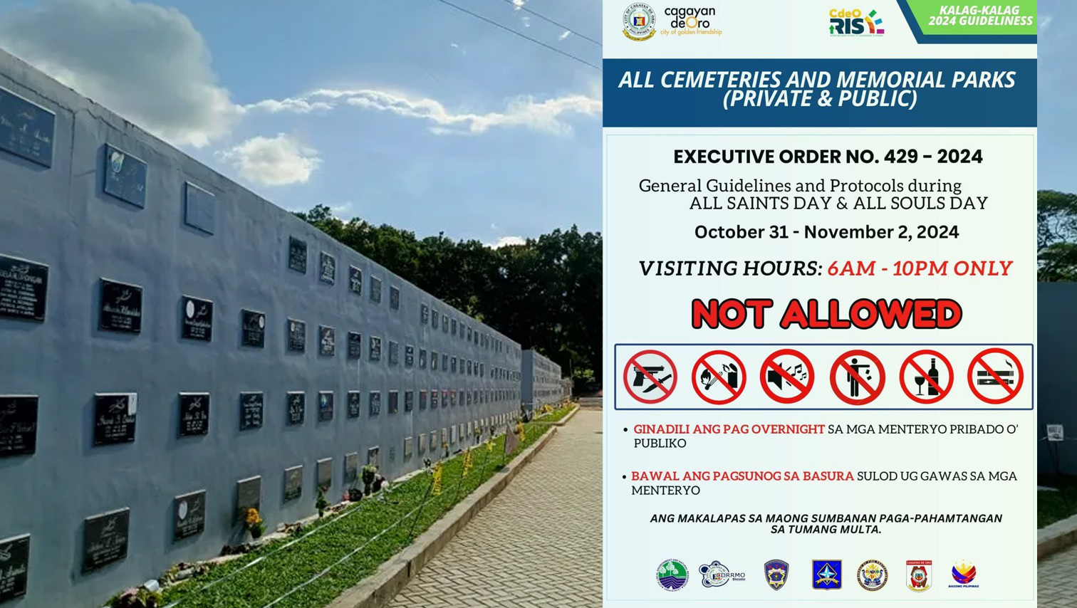 The City Government of Cagayan de Oro has prohibited overnight stays in all public and private cemeteries and memorial parks from October 31 to November 2, 2024, in observance of All Saints’ Day and All Souls’ Day. This directive follows Executive Order No. 429-2024, which outlines the guidelines and protocols to ensure the safety, orderliness, and smooth flow of visitors as families traditionally visit the graves of their departed loved ones. During this period, cemeteries and memorial parks will only be open to the public from 6:00 AM to 10:00 PM.