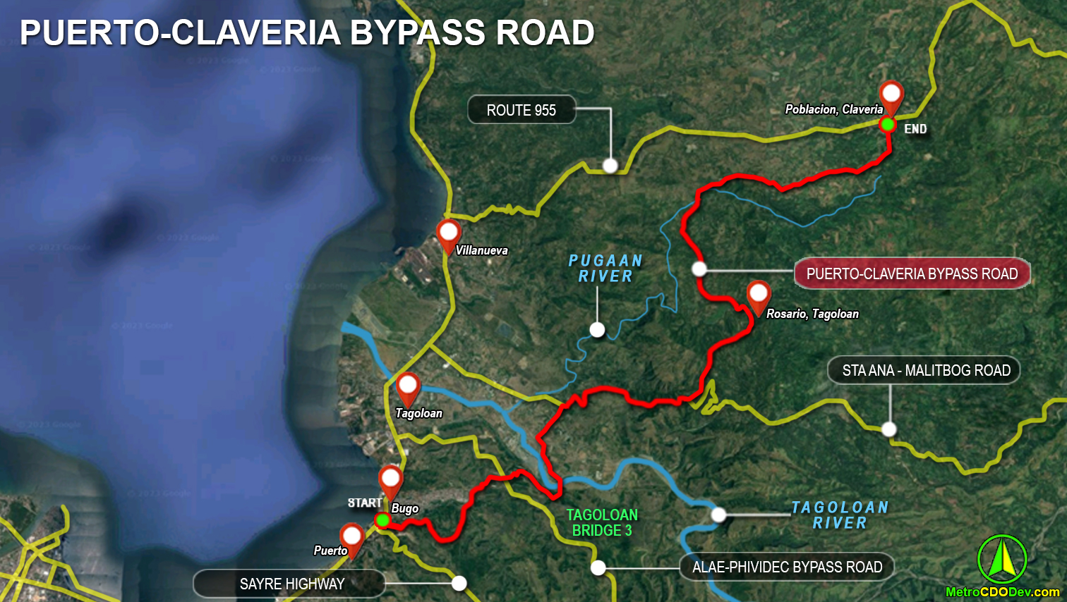 Shown below is the indicative alignment. From Brgy Puerto (National Highway), the road will traverse east towards Upper Bugo and pass at the back of Villa Trinitas Subdivision then goes northeast crossing Tagoloan River (via new Tagoloan Bridge 3) towards Brgy. Sta Ana (Tagoloan) and follows the Sta. Ana – Malitbog Road then turns north towards Brgy Rosario (Tagoloan) connecting to Brgy Punong in Claveria then northeast to Poblacion, Claveria. The Puerto-Claveria Road also traverses the Alae-Phividec Bypass Road.