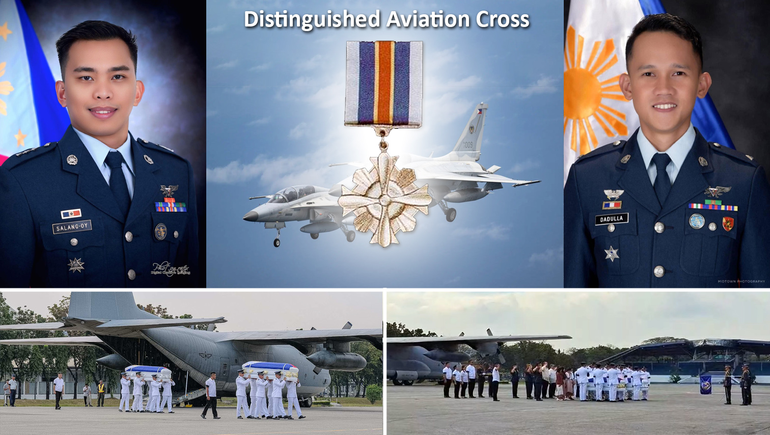 The remains of Major Jude Salang-oy and 1Lt. April John Dadulla have arrived at Villamor Air Base in Pasay City for a vigil. During the ceremony, Defense Secretary Gilbert Teodoro along with AFP Chief of Staff Gen. Romeo Brawner Jr and Special Assistant to the President Sec. Antonio Lagdameo Jr. posthumously awarded the fallen fighter pilots the Distinguished Aviation Cross, the highest honor for the Air Force. Their remains will be transported to Basa Air Base in Pampanga tomorrow, March 9, for another vigil with the air force community.