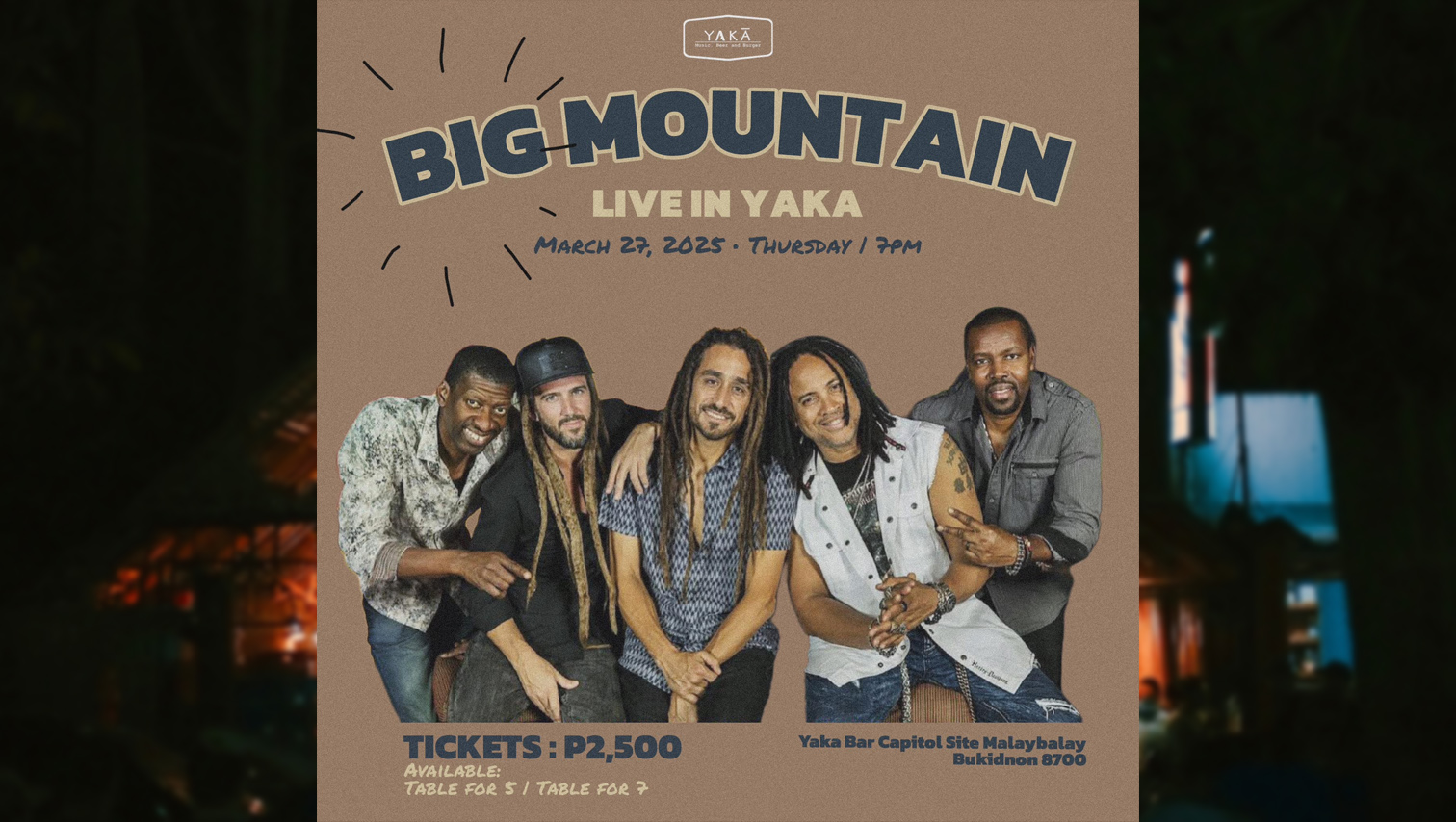 Big Mountain, the iconic American reggae band known for their 1994 hit cover of Peter Frampton’s “Baby, I Love Your Way”, is set to perform in a special one night show at Yaka Bar in Malaybalay City in Bukidnon on March 27. Regular tickets are priced at P2,500. For tickets and sponsorship inquiries, just contact 0945 450 5045. Hurry, slots are limited.
