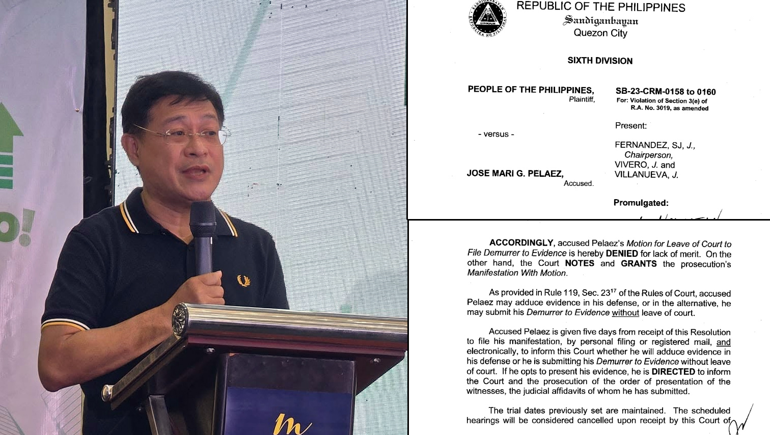 The Sandiganbayan has denied the petition of former Misamis Oriental Vice Governor Jose Mari Pelaez to dismiss the graft cases against him, which involve irregularities in the provincial board’s payroll from 2014 to 2016. In its resolution promulgated on March 21, 2025, the anti-graft court denied Pelaez’s Motion for Leave of Court to File a Demurrer to Evidence, for lack of merit. Read the resolution below.