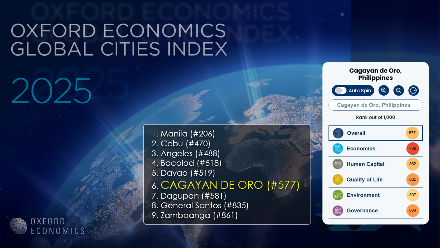 Cagayan de Oro City has made the list of 1,000 world’s largest urban economies for the second year in a row based on the 2025 Oxford Economics Global Cities Index. The city ranked sixth among nine Philippine cities in the list ranking 577th globally, dropping from last year’s 487th ranking. Other cities in the list are Manila (#206), Cebu (#470), Angeles (#488), Bacolod (#518), Davao (#519), Dagupan (#581), General Santos (#835) and Zamboanga (#861). The rankings are based on five categories: economics, human capital, quality of life, environment, and governance. See the rankings of the Philippine cities below.