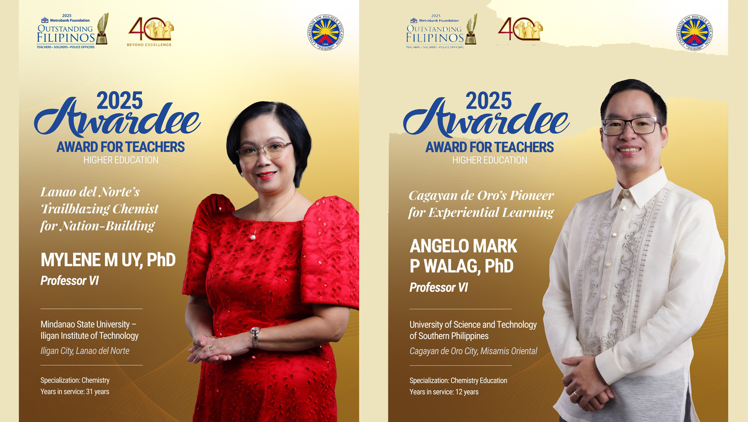 Dr. Mylene M. Uy of Mindanao State University–Iligan Institute of Technology (MSU-IIT) and Dr. Angelo Mark P. Walag of the University of Science and Technology of Southern Philippines (USTP) in Cagayan de Oro, have been named as this year’s teacher-awardees of the Metrobank Foundation Outstanding Filipinos. Both are recognized for their innovative, science-based work that helps communities, promotes inclusive education, and supports sustainable national development. Congratulations!