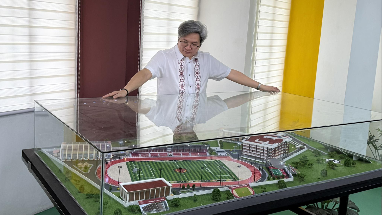 Mindanao State University – Iligan Institute of Technology (MSU-IIT) Chancellor Alizedney M. Ditucalan examines a scale model of the proposed MSU-IIT Sports Complex at the university’s Hinaplanon campus in Iligan City. Once completed, the facility will be the first sports complex in the city and will feature indoor amenities for swimming, badminton, volleyball, and more, along with outdoor courts for basketball and tennis, and a stadium for soccer, track, and field events. The complex is expected to enhance the university’s physical education program and serve as a training ground for local athletes preparing for national and international competitions. The project is currently awaiting funding.