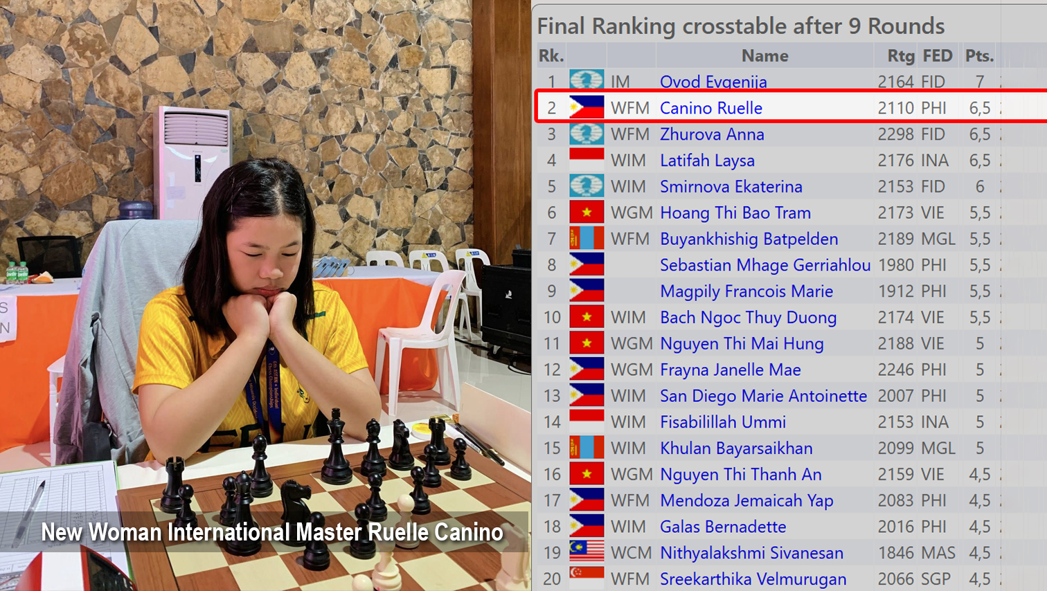 Woman FIDE Master (WFM) Ruelle Canino of Cagayan de Oro earned the Woman International Master (WIM) title after winning silver in the Women’s Division of the 6th ASEAN+ Individual Chess Championships (Gov. Henry Oaminal Cup) held at the Misamis Occidental Resort and Aquamarine Park in Sinacaban, Misamis Occidental. The 17-year-old finished with 6.5 points—just half a point behind champion IM Evgenija Ovod of Russia (7 points)—and edged out Russia’s WFM Anna Zhurova and Indonesia’s WIM Laysa Latifah via tiebreak. Canino’s impressive performance also earned her first Woman Grandmaster (WGM) norm.