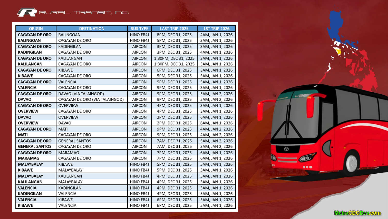 Passengers planning their year-end and New Year travel are advised to take note of the updated bus schedules of Rural Transit Mindanao Inc. (RTMI) at the Cagayan de Oro Agora Bus Terminal, covering the last trips of 2025 and the first trips of 2026 to Bukidnon, Davao and General Santos, and vice versa. For specific route schedules, see the latest advisory below. As holiday travel tends to be busy, arriving early at the bus terminal is highly recommended to ensure a more comfortable and stress-free journey. Safe travels!