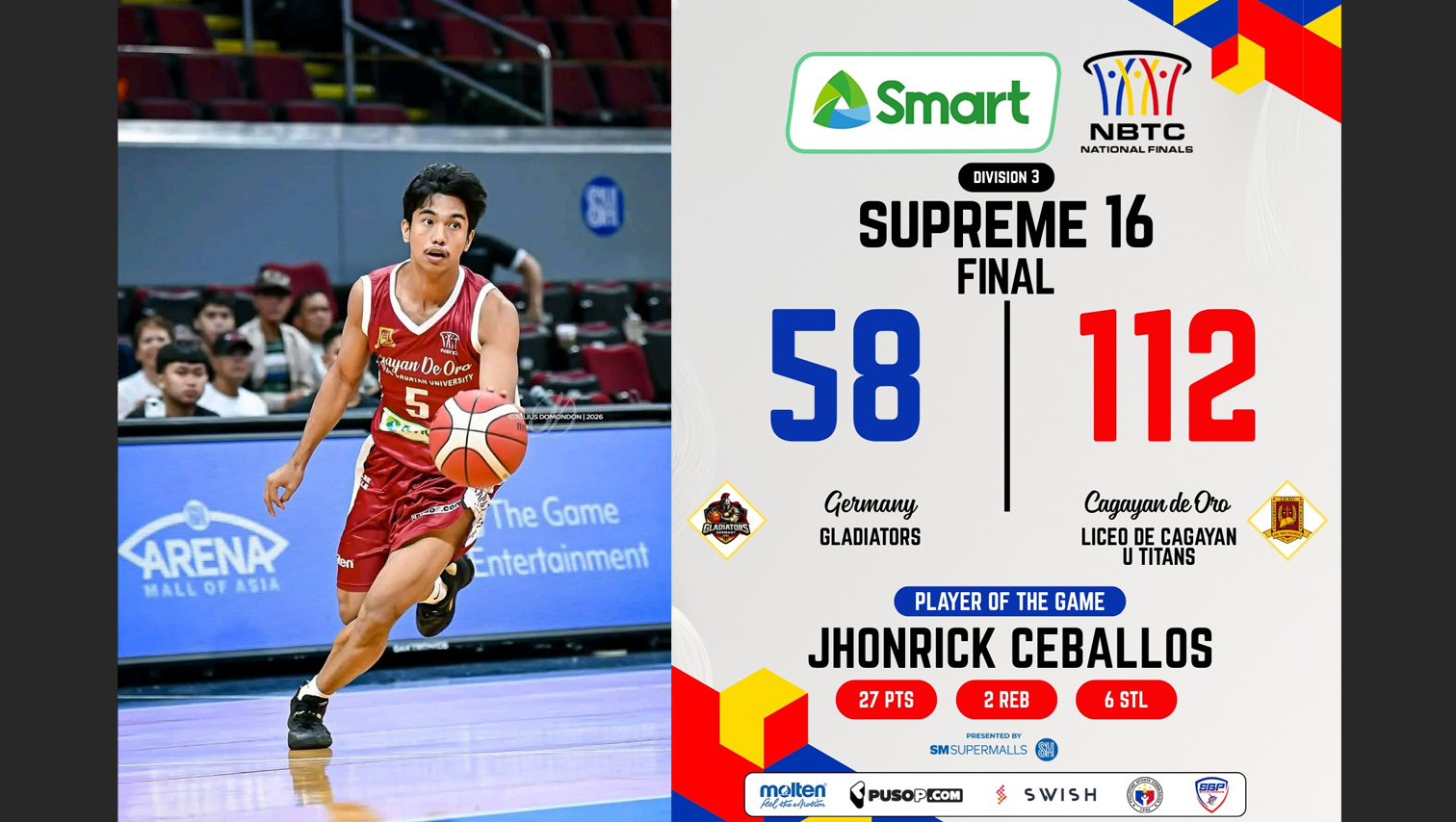 Jhonrick Ceballos erupted for 27 points and six steals as the Liceo de Cagayan University Titans routed the Germany Gladiators, 112–58, to advance to the Fantastic 8 of Division 3 in the NBTC National Finals. They will next face the Canterbury Ballers Club of New Zealand, with the winner earning a spot in the Final Four.